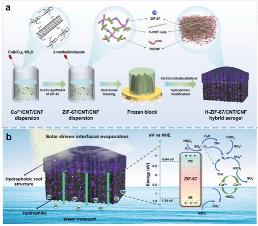 課題組研究了一種基于TEMPO氧化納米纖維氣凝膠的新型Janus太陽(yáng)能蒸發(fā)器(HZC-CNF),基于垂直排列的通道和錐形屋頂?shù)莫?dú)特結(jié)構(gòu)不僅實(shí)現(xiàn)了光有效吸附和多次散射,還增強(qiáng)了蒸發(fā)面積和水的傳輸路徑。HZC-CNF表現(xiàn)出優(yōu)異的光熱轉(zhuǎn)換能力、良好水分蒸發(fā)率(1.97 kg m-2 h-1)和對(duì)包括環(huán)丙沙星在內(nèi)的各種污染物(>90 %)的去除效率,可實(shí)現(xiàn)光熱水蒸發(fā)和污染物降解的協(xié)同作用。相關(guān)研究成果以“Janus structured cellulose-based aerogel with vertical channels and conical roof for efficient solar-driven water evaporation and pollutant degradation”為題發(fā)表在《Carbohydrate Polymers》上。23級(jí)博士生田國(guó)棟為本文第一作者,段超教授和王建教授為通訊作者。