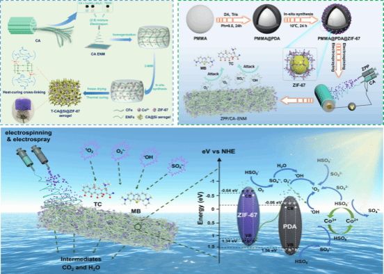 課題組提出使用醋酸纖維素作為靜電紡絲原料,并通過(guò)原位沉積、硅烷化改性和冷凍干燥等技術(shù)制備高彈性疏水氣凝膠(T-ENA),用于高效分離油和降解卡馬西平(CBZ)。通過(guò)熱固化手段交聯(lián)Si-O-鍵,成功賦予ENA的熱/機(jī)械穩(wěn)定性及疏水性,T-ENA對(duì)油水中甲苯的吸附分離效率高達(dá)99.2%,在20分鐘內(nèi)即可活化PMS催化降解99.5%的殘留有機(jī)藥物(CBZ)。同時(shí),通過(guò)同步靜電紡絲和靜電噴霧技術(shù),制備了負(fù)載核殼“Z”型異質(zhì)結(jié)催化劑的纖維素基光催化靜電紡絲膜。在光照和PMS的作用下,對(duì)TC和MB的降解效率分別達(dá)到93.31%和99.90%。相關(guān)研究成果以“Cellulose acetate-based electrospun nanofiber aerogel with excellent resilience and hydrophobicity for efficient removal of drug residues and oil contaminations from wastewater”和“Facile fabrication of a cellulose-based photocatalytic membrane decorated with core-shell heterojunction microspheres for efficient and continuous wastewater remediation”為題發(fā)表在《Carbohydrate Polymers》和《Separation and Purification Technology》上。23級(jí)博士研究生田國(guó)棟為本文第一作者,段超教授和倪永浩教授為通訊作者。