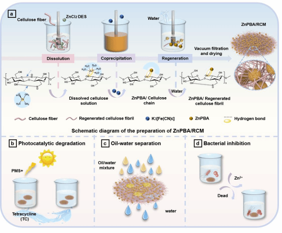 課題組研究提出了一種簡(jiǎn)單易行的“一石二鳥(niǎo)”策略,構(gòu)建了普魯士藍(lán)類(lèi)似物(ZnPBA)微球修飾的多功能再生纖維素復(fù)合膜,用于廢水凈化。ZnPBA/RCM具有較高的ZnPBA負(fù)載量(65.3wt%)、良好的光催化降解四環(huán)素(TC)(去除率為90.3%,礦化率為54.3%)、油水分離效率(對(duì)不同種類(lèi)的油均>97.8%)和抗菌性能。相關(guān)研究成果以“A one-stone-two-birds strategy for cellulose dissolution, regeneration, and functionalization as a photocatalytic composite membrane for wastewater purification”為題發(fā)表在《International Journal of Biological Macromolecules》上。22級(jí)碩士生劉笑霜為本文主要完成人,段超教授為第一和通訊作者。