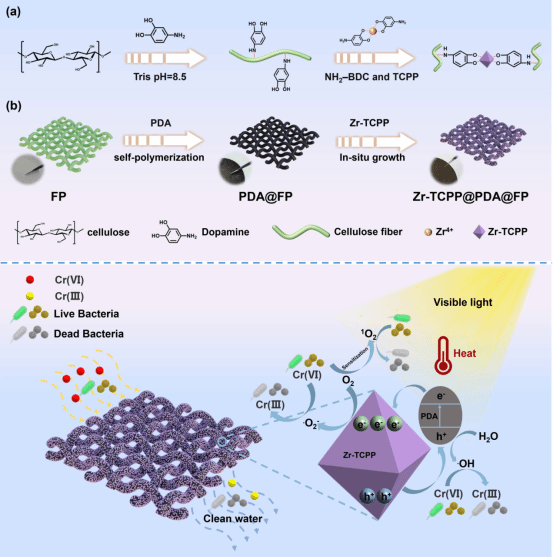 課題組研究制備了一種纖維素紙基復(fù)合膜(Zr-TCPP@PDA@FP),用于Cr(VI)的光還原和光熱抗菌。Zr-TCPP@PDA@FP對(duì)Cr(VI)表現(xiàn)出明顯的光催化還原作用,在20min內(nèi)去除率達(dá)到93.9%,且具有良好的循環(huán)穩(wěn)定性。此外,雜化膜還具有良好的光熱抗菌性能。相關(guān)研究成果以“Mussel-inspired polydopamine and Zr-porphyrin MOF co-decoration of a cellulose paper-based composite membrane for efficient photoreduction of Cr(VI) and photothermal antibacterial in wastewater”為題發(fā)表在《Separation and Purification Technology》上。22級(jí)碩士研究生車(chē)莎莎為本文主要完成人,段超教授為第一和通訊作者。