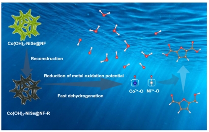 團隊開發(fā)出一種通過電化學重構制備的高效電催化劑Co(OH)2-NiSe@NF-R,成功實現5-羥甲基糠醛(HMF)電催化氧化制備2,5-呋喃二甲酸(FDCA)的高選擇性轉化。研究團隊通過設計Co(OH)2-NiSe@NF前驅體,在堿性介質中經電化學重構形成富含高價活性位點(CoOOH和NiOOH)的催化劑表面。研究揭示了Co(OH)2-NiSe@NF重構機理:重構過程中硒元素被氧化為硒酸鹽(SeO42-)并附著于氫氧化物表面,通過降低晶格羥基脫氫能壘,促進高價金屬活性位點的形成。該工作以“Revealing the electrochemical reconstruction behavior of Co(OH)2-NiSe for efficient the electrooxidation of 5-hydroxymethylfurfural”為題發(fā)表在《Chemical Engineering Journal》。23級博士生朱嘉琦為第一作者,王偉濤副教授、劉昭鐵教授和韓布興研究員為通訊作者。