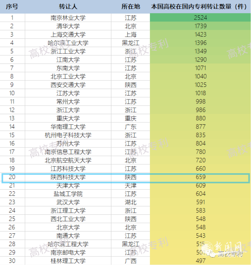 近日,高校專利公眾號發(fā)布“最新中國高校專利轉(zhuǎn)讓榜單(TOP100)”(下文簡稱“榜單”),我校以轉(zhuǎn)讓659件居全國排名第20位,陜西高校第2位,省屬高校第1位。這是繼我校獲得國家知識產(chǎn)權(quán)試點(diǎn)高校后,進(jìn)一步深化實(shí)施創(chuàng)新驅(qū)動戰(zhàn)略,強(qiáng)化知識產(chǎn)權(quán)創(chuàng)造、保護(hù)和運(yùn)用,扎實(shí)推進(jìn)科技成果轉(zhuǎn)移轉(zhuǎn)化的又一次突破。