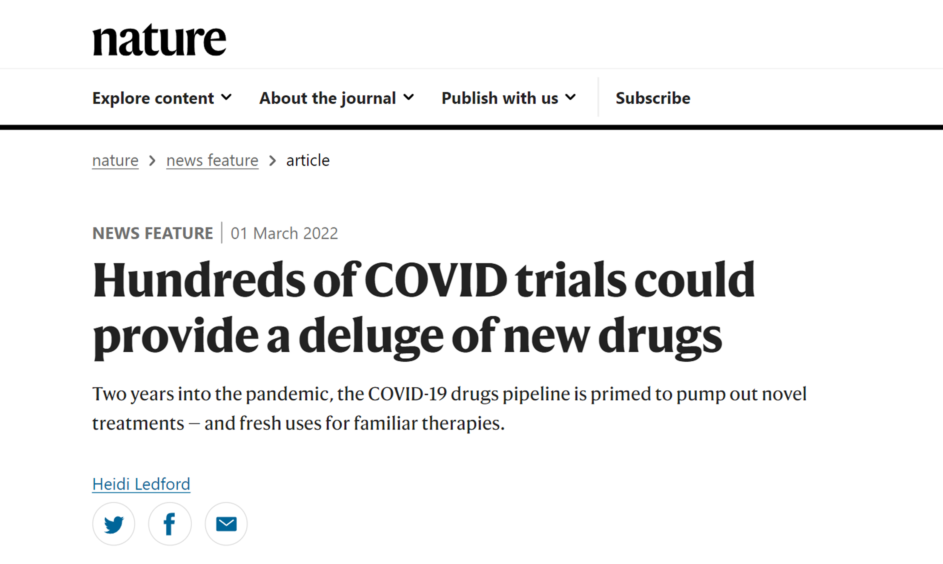 2022年3月1日,《Nature》刊出了題為“Hundreds of COVID trials could provide a deluge of new drugs”的新冠肺炎藥物研發(fā)專題報(bào)道(https://www.nature.com/articles/d41586-022-00562-0;Nature 603,25-27(2022);doi:https://doi.org/10.1038/d41586-022-00562-0)。