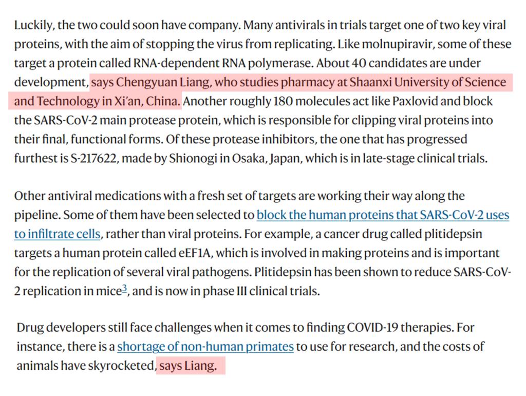 該報(bào)道采訪了包括美國(guó)國(guó)立健康研究院(NIH)Lawrence Tabak 、牛津大學(xué)Peter Horby等在內(nèi)的5個(gè)知名新冠肺炎藥物研究團(tuán)隊(duì)。我校陜西省生物醫(yī)藥重點(diǎn)產(chǎn)業(yè)鏈成果轉(zhuǎn)化創(chuàng)新團(tuán)隊(duì)核心成員、食品與生物工程學(xué)院藥學(xué)系梁承遠(yuǎn)副教授作為亞太地區(qū)唯一受訪者接受了《Nature》雜志25分鐘的電話采訪,回答了關(guān)于中藥在新冠肺炎治療中的應(yīng)用,RNA依賴性RNA聚合酶(RdRp)和3CL蛋白酶(3CLpro)抑制劑各自優(yōu)劣比較,新冠病毒治療藥物開發(fā)面臨的制約因素,新冠藥物開發(fā)的新靶標(biāo)等問題。
