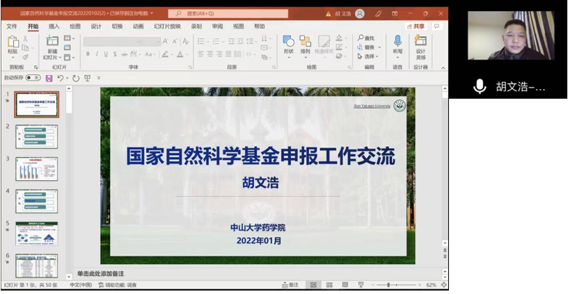 1月24日下午,應(yīng)食品學(xué)院及科技處、前沿院邀請(qǐng),中山大學(xué)藥學(xué)院院長(zhǎng)、國(guó)家杰出青年基金獲得者、教育部“長(zhǎng)江學(xué)者”特聘教授胡文浩教授云做客我?!扒把乜茖W(xué)報(bào)告”,并作了題為“國(guó)家自然科學(xué)基金申報(bào)工作交流”線上學(xué)術(shù)報(bào)告,報(bào)告由食品學(xué)院副院長(zhǎng)李國(guó)梁主持,學(xué)院全體基金申報(bào)教師參加了本次報(bào)告會(huì)。