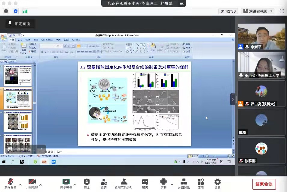 1月20日下午,應(yīng)我校輕工科學(xué)與工程學(xué)院、科技處及前沿院邀請(qǐng),華南理工大學(xué)王小英教授做客我校“前沿科學(xué)報(bào)告”,作了題為“多糖基抗菌劑的綠色構(gòu)建及功能調(diào)控”的線上學(xué)術(shù)報(bào)告。報(bào)告由輕工學(xué)院黨委書(shū)記李新平主持,學(xué)院部分教師及相關(guān)專業(yè)研究生參加了本次報(bào)告。