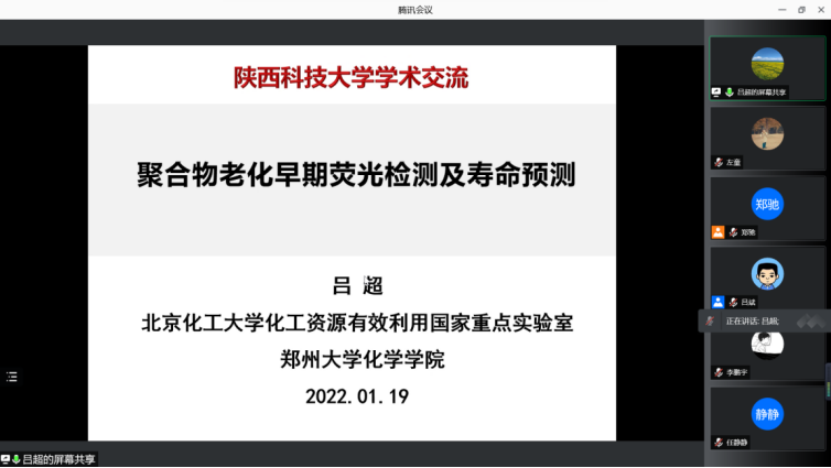1月19日下午,受我校輕工科學(xué)與工程學(xué)院、科技處及前沿院邀請(qǐng),北京化工大學(xué)呂超教授做客我?!扒把乜茖W(xué)報(bào)告”,作了題為“聚合物老化早期熒光檢測(cè)及壽命預(yù)測(cè)”的線上學(xué)術(shù)報(bào)告。報(bào)告會(huì)由輕工學(xué)院院長(zhǎng)呂斌主持,學(xué)院相關(guān)專業(yè)教師及研究生參加了本次學(xué)術(shù)報(bào)告會(huì)。