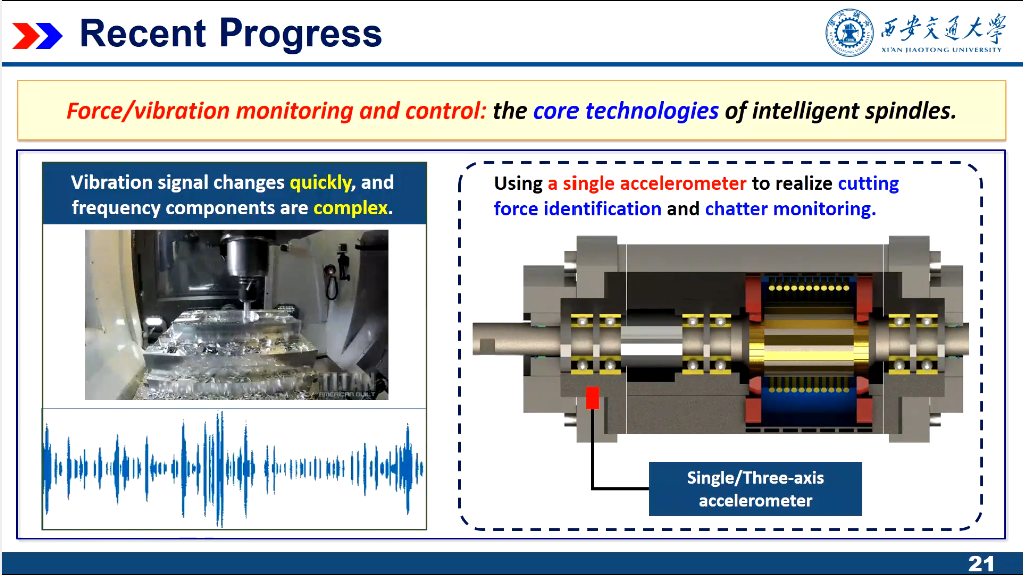 曹宏瑞分享了機(jī)床主軸的歷史沿革和國(guó)內(nèi)外研究現(xiàn)狀,說(shuō)明了智能機(jī)床又被稱為是“工業(yè)母機(jī)”,主軸作為機(jī)床的核心功能部件,其性能直接決定機(jī)床整機(jī)的技術(shù)水平。隨著航空航天和軍工能源等重大領(lǐng)域?qū)Ω咚俑咝Ш透呖煽考庸さ钠惹行枨笠约爸悄軝C(jī)床的發(fā)展,主軸單元智能化勢(shì)在必行。向大家講解了狀態(tài)監(jiān)測(cè)診斷與振動(dòng)控制作為智能主軸核心特征的集中體現(xiàn),是保障主軸高效可靠工作的核心要素。展示了課題組通過(guò)集成壓電作動(dòng)器、振動(dòng)傳感器等裝置,開(kāi)發(fā)出的具備振動(dòng)監(jiān)控功能的智能主軸。并提出了利用壓電作動(dòng)器,通過(guò)模糊控制策略對(duì)高速銑削顫振進(jìn)行主動(dòng)控制和銑削穩(wěn)定性提升的先進(jìn)方法。