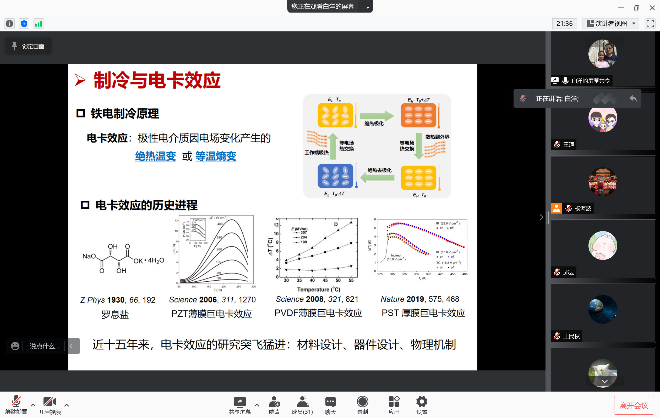 白洋教授從課題組的研究工作出發(fā),分別從鐵電研究發(fā)展歷程簡(jiǎn)述、電卡效應(yīng)研究發(fā)展——電場(chǎng)與相變、高維相圖的建立與電卡效應(yīng)的關(guān)系、基于機(jī)器學(xué)習(xí)的鐵電相圖預(yù)測(cè)與材料設(shè)計(jì)四個(gè)方面詳細(xì)地做了前沿科學(xué)報(bào)告。會(huì)后,白洋教授針對(duì)師生所提出的問題進(jìn)行了熱烈的討論及耐心的解答,為材料學(xué)院從事電卡相關(guān)研究方面師生所遇到的科研問題進(jìn)行了建議指導(dǎo),使各位師生深受啟發(fā)。此次報(bào)告為材料學(xué)院師生在電卡材料方面的研究提供了思路和參考,對(duì)科研水平的進(jìn)一步提高起到了重要作用。