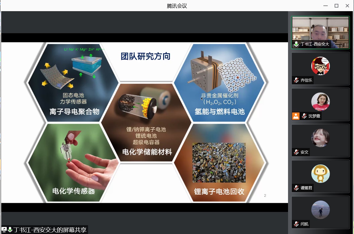 1月18日上午,應(yīng)我校輕工科學(xué)與工程學(xué)院、科技處及前沿院邀請,西安交通大學(xué)丁書江教授做客我?!扒把乜茖W(xué)報告”,作了題為“無機納米片陣列/聚合物復(fù)合固態(tài)電解質(zhì)研究及申請國家自然科學(xué)基金體會”的線上學(xué)術(shù)報告。報告由輕工學(xué)院院長呂斌主持,學(xué)院部分教師及相關(guān)專業(yè)研究生參加了本次報告。