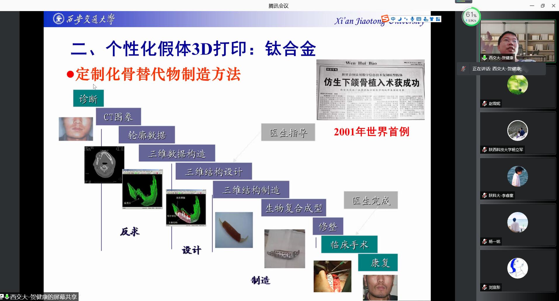 賀健康從3D打印的醫(yī)學應用、個性化假體3D打印、可降解支架3D打印、微納生物3D打印四個方面,講解了國內外生物3D打印領域的研究前沿和發(fā)展動態(tài)。對相關研究方向在申請國家自然科學基金時如何緊跟國內外生物3D打印領域前沿、獨辟蹊徑、深挖科學問題提供了建設性的思路。通過他們團隊科研成果落地醫(yī)院臨床應用的大量實例,講述了科學家、醫(yī)生、工程師如何成功合作,服務人類健康,挽救患者生命及提高人民生活質量,貢獻生物3D打印科研人員的力量。對我校生物3D打印研究服務陜西地方經(jīng)濟,加快裝備與產品產業(yè)化應用帶來了寶貴經(jīng)驗。最后,賀健康在3D打印與臨床醫(yī)學結合、假體制造、支架與活性器官制造宏微結構一體化、3D打印技術等醫(yī)工交叉領域如何創(chuàng)新性地開展科研給出了可操作性的建議。報告不僅對學院生物3D打印領域技術研究具有重要的借鑒和指導意義,同時對學院仿生制造技術與理論學科方向發(fā)展及博士點建設具有重要的促進作用。
