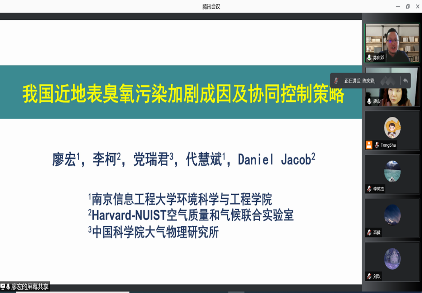 12月30日,應環(huán)境科學與工程學院、科技處及前沿院邀請,南京信息工程大學教授、博士生導師廖宏做客我?!扒把乜茖W報告”,作了題為“我國近地表臭氧污染加劇成因及協(xié)同控制策略”的線上學術(shù)報告,環(huán)境學院及其他兄弟院校、科研院所師生200余人聆聽了本次報告。會議由環(huán)境學院陳慶彩教授主持。