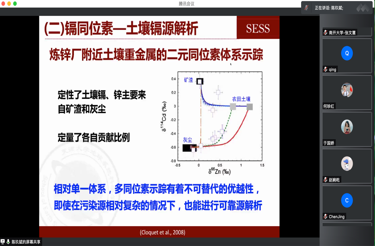 12月21日,受環(huán)境科學(xué)與工程學(xué)院邀請(qǐng),南方科技大學(xué)傅宗玫教授、天津大學(xué)陳玖斌教授做客我?!扒把乜茖W(xué)報(bào)告”,并分別以“大氣有機(jī)氣溶膠關(guān)鍵組分的來(lái)源、演化及環(huán)境效應(yīng)”“大金屬穩(wěn)定同位素在環(huán)境健康領(lǐng)域的潛在應(yīng)用”為題作了精彩的學(xué)術(shù)報(bào)告,環(huán)境學(xué)院及其他兄弟院校、科研院所師生200多人在線參加了會(huì)議。環(huán)境學(xué)院陳慶彩教授主持會(huì)議。