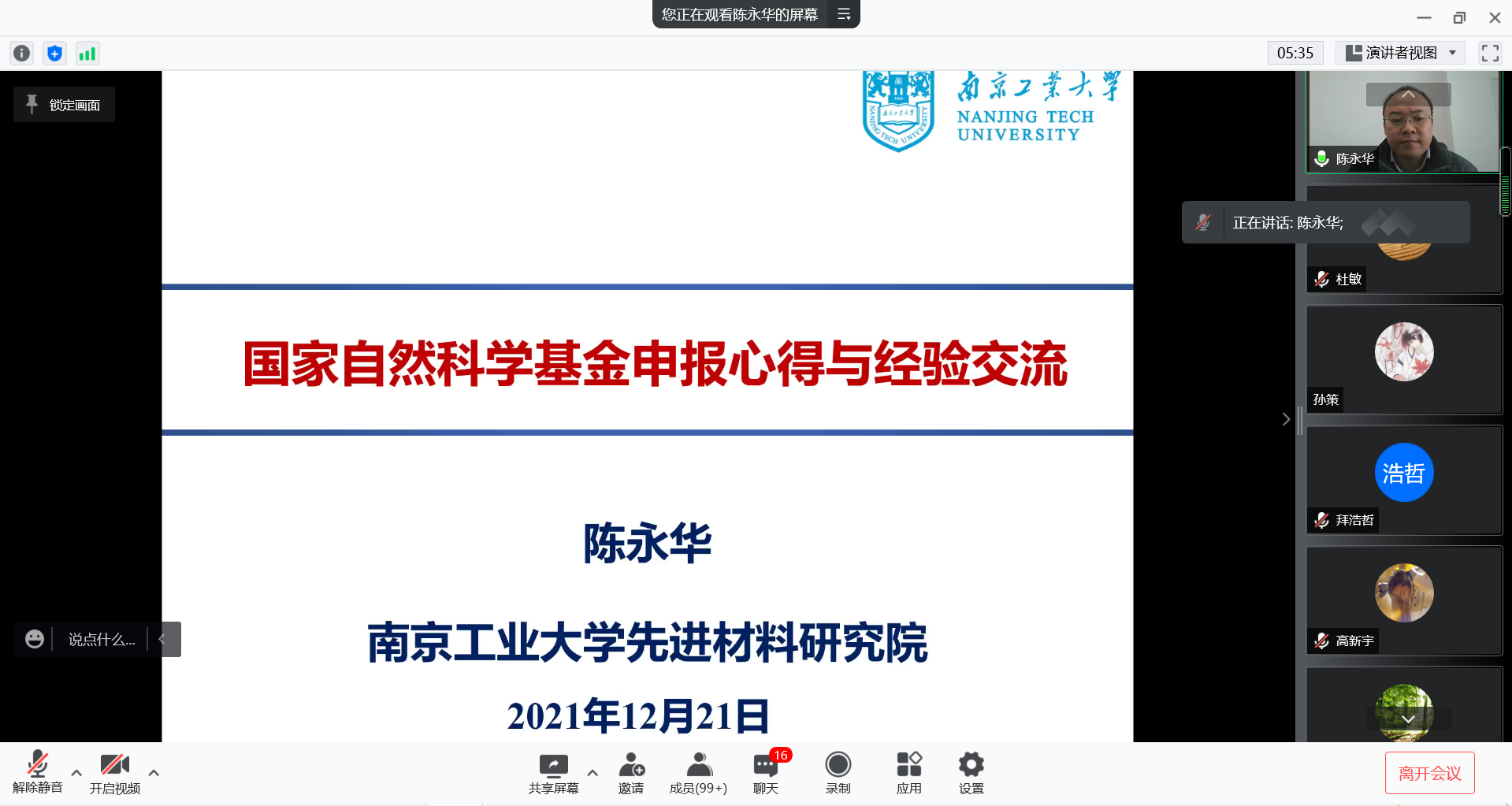 12月21日下午,受我校輕工科學與工程學院、科技處及前沿院邀請,南京工業(yè)大學陳永華教授以線上形式作了題為“國家自然科學基金申報心得與經(jīng)驗交流”以及“離子液體鈣鈦礦光伏電池”的精彩報告,本次報告會由輕工學院副院長劉國棟主持,學院相關專業(yè)教師及研究生聆聽了本次報告。