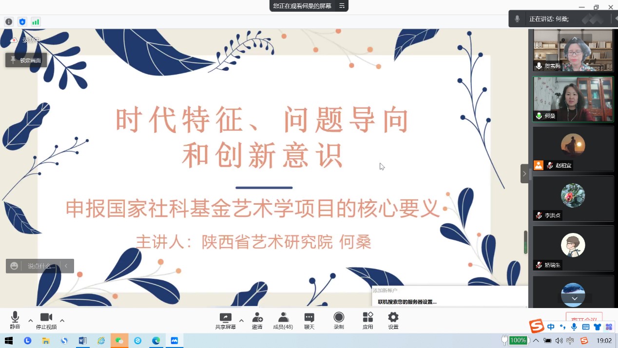 12月23日晚,應(yīng)設(shè)計(jì)與藝術(shù)學(xué)院與科技處邀請(qǐng),陜西省藝術(shù)研究院副院長(zhǎng)何桑教授云端做客我?!扒把乜茖W(xué)報(bào)告”,作了題為“時(shí)代特征、問題導(dǎo)向和創(chuàng)新意識(shí)——申報(bào)國(guó)家社科基金藝術(shù)學(xué)項(xiàng)目的核心要義”的學(xué)術(shù)報(bào)告。報(bào)告會(huì)由設(shè)藝學(xué)院副院長(zhǎng)賀雪梅主持,學(xué)院全體教師及部分研究生聆聽了此次精彩分享。