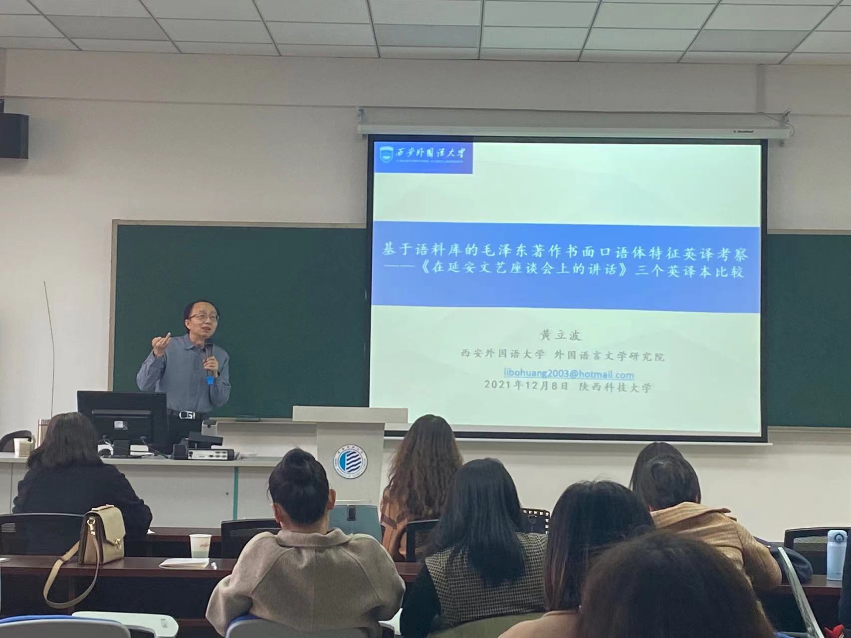 12月8日下午,應(yīng)文理學(xué)院邀請(qǐng),西安外國(guó)語(yǔ)大學(xué)黃立波教授做客我校前沿科學(xué)報(bào)告,作了題為《基于語(yǔ)料庫(kù)的毛澤東著作書面口語(yǔ)體特征英譯考察——<在延安文藝座談會(huì)上的講話>三個(gè)英譯本比較》的報(bào)告。報(bào)告由外語(yǔ)系主任李俊葉主持,外語(yǔ)系教師和翻譯專業(yè)研究生聆聽了此次報(bào)告。