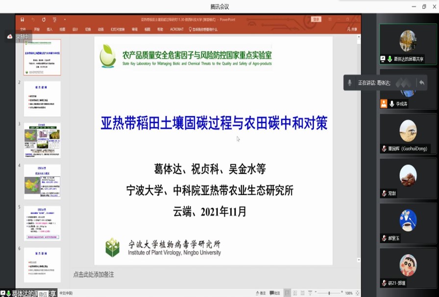 11月30日,受我校科技處及環(huán)境科學(xué)與工程學(xué)院邀請,寧波大學(xué)葛體達(dá)教授作客我?!扒把乜茖W(xué)報告”,并以“亞熱帶稻田土壤固碳過程與農(nóng)田碳中和對策”為題,圍繞目前“雙碳”熱點話題作了一場精彩的學(xué)術(shù)報告,環(huán)境學(xué)院師生及其他兄弟院校、科研院所師生共計230多人在線參加了會議。會議由環(huán)境學(xué)院副院長李成濤主持。