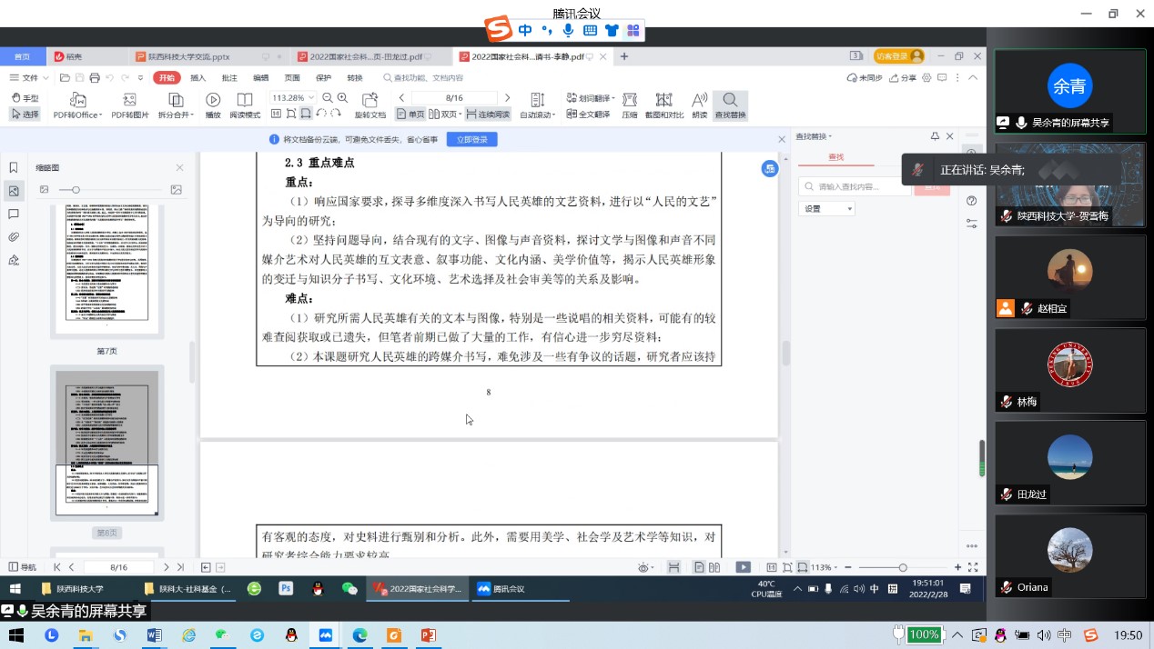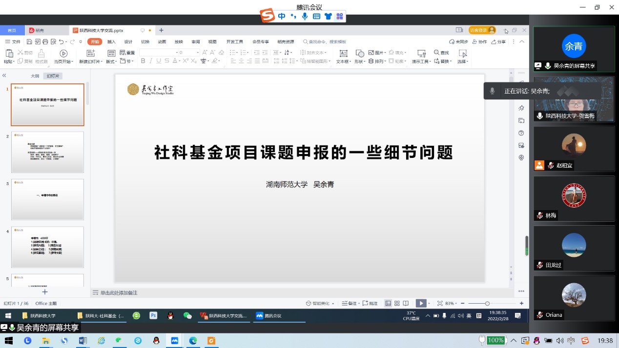 2月28日晚,應(yīng)設(shè)計(jì)與藝術(shù)學(xué)院與科技處邀請(qǐng),湖南師范大學(xué)吳余青教授云端做客我校“前沿科學(xué)報(bào)告”,作了題為“國(guó)家社科基金項(xiàng)目申報(bào)論證輔導(dǎo)”的學(xué)術(shù)報(bào)告。報(bào)告會(huì)由設(shè)藝學(xué)院副院長(zhǎng)賀雪梅教授主持,學(xué)院部分教師聆聽(tīng)了此次精彩分享。