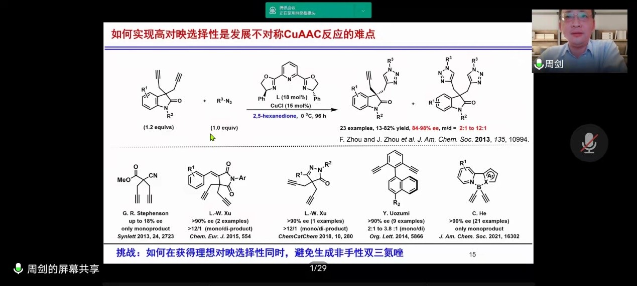 周劍教授在協(xié)同催化方面有很深的研究,他以團(tuán)隊(duì)在實(shí)際工作中遇到的困難和解決的問(wèn)題為例,從與藥物化學(xué)協(xié)同創(chuàng)新、酮亞胺的協(xié)同研究、α-手性叔胺的不對(duì)稱催化合成策略等方面進(jìn)行了詳細(xì)介紹。周教授表示不對(duì)稱催化是現(xiàn)階段藥物化學(xué)的重要研究手段,而協(xié)同催化是發(fā)展新型不對(duì)稱催化反應(yīng)的一種重要合成策略。