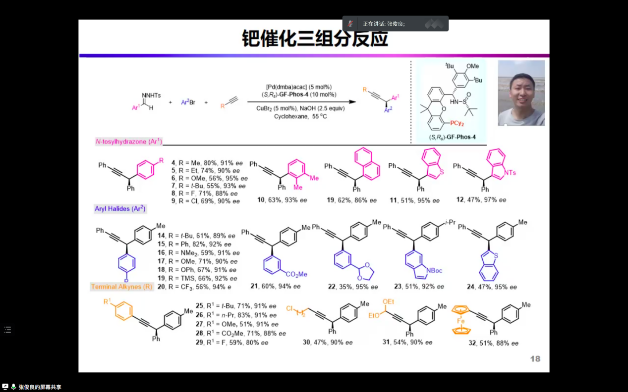 張俊良教授從學(xué)術(shù)界和工業(yè)界的分歧出發(fā)提出了手性配體設(shè)計(jì)的“IDEAL”原則,基于非C2對(duì)稱性、剛?cè)岵?jì)、軟硬(原子)兼施的設(shè)計(jì)理念,發(fā)展了一類具有自主知識(shí)產(chǎn)權(quán)的手性Sadphos配體。他指出,晶體結(jié)構(gòu)研究表明該手性配體與過(guò)渡金屬具有豐富的配位模式,它們與金、銅、鈀等過(guò)渡金屬組成的手性催化劑在各類不對(duì)稱催化反應(yīng)中展現(xiàn)出獨(dú)特的優(yōu)勢(shì),解決了一系列有機(jī)反應(yīng)對(duì)映選擇性難以控制的難題,如醛的α-位不對(duì)稱芳基化反應(yīng)、鈀催化三組分反應(yīng)和Asymmetriccarboetherification,從不對(duì)稱β-H消除反應(yīng)、不對(duì)稱偶聯(lián)反應(yīng)、炔烴的不對(duì)稱氫膦化反應(yīng)和二級(jí)膦氫化合物的不對(duì)稱芐基化-動(dòng)力學(xué)拆分等。