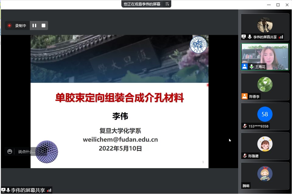 李偉教授從介孔材料在能源、健康、信息、環(huán)境、安全等領(lǐng)域應(yīng)用的背景出發(fā),介紹了單膠束定向合成介孔材料的相關(guān)研究:精準(zhǔn)構(gòu)筑了系列核殼結(jié)構(gòu)功能復(fù)合介孔材料;通過(guò)調(diào)控表面電負(fù)性,疏水作用調(diào)控表面活性劑組裝,實(shí)現(xiàn)單膠束基元可控組裝;發(fā)展了聚合物輔助的轉(zhuǎn)移方法,構(gòu)筑了自支撐介孔氧化硅分離膜,實(shí)現(xiàn)了膠體納米晶的分離和提純;調(diào)控疏水相大小和膠束數(shù)量,實(shí)現(xiàn)孔道結(jié)構(gòu)和孔道大小的定向構(gòu)筑;程序化調(diào)控單膠束基元定向組裝實(shí)現(xiàn)了多級(jí)結(jié)構(gòu)介孔碳納米球結(jié)構(gòu)調(diào)控;疏水/親水嵌段比調(diào)控單膠束基元的結(jié)構(gòu)實(shí)現(xiàn)介觀相的調(diào)控。
