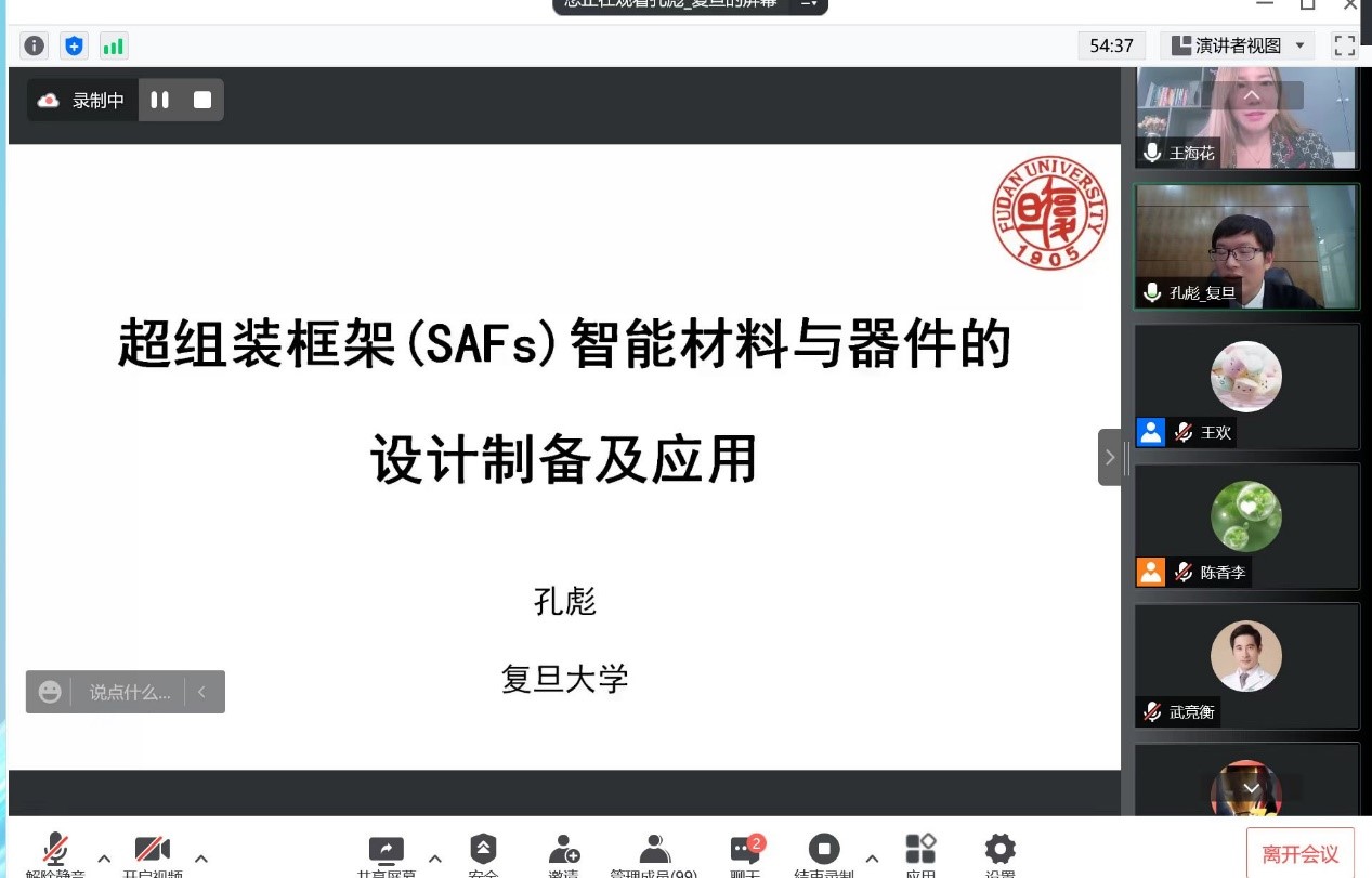 孔彪教授針對(duì)超組裝框架(SAFs)材料設(shè)計(jì)合成,SAFs智能納米通道在分子感知中的應(yīng)用,SAFs智能微納米界面在生物診療中的應(yīng)用以及SAFs在一體化可穿戴器件中的應(yīng)用四個(gè)方面展開詳細(xì)介紹,構(gòu)建了多種超組裝的智能材料與器件。