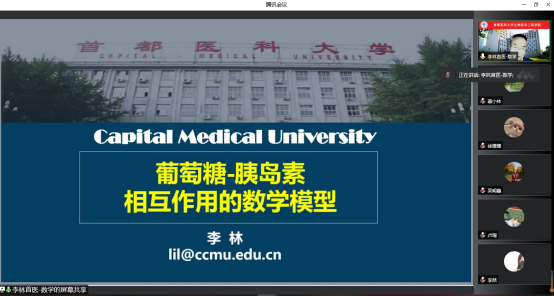 5月24日下午,應(yīng)我校數(shù)學(xué)與數(shù)據(jù)科學(xué)學(xué)院、科技處及前沿院邀請,首都醫(yī)科大學(xué)李林教授做客我?!扒把乜茖W(xué)報告”,作了題為“葡萄糖-胰島素相互作用的數(shù)學(xué)模型角膜在體生物力學(xué)參數(shù)的識別與探索”的線上報告。報告會由數(shù)學(xué)學(xué)院學(xué)術(shù)帶頭人藺小林教授主持,學(xué)院相關(guān)教師、研究生參加了此次報告會。