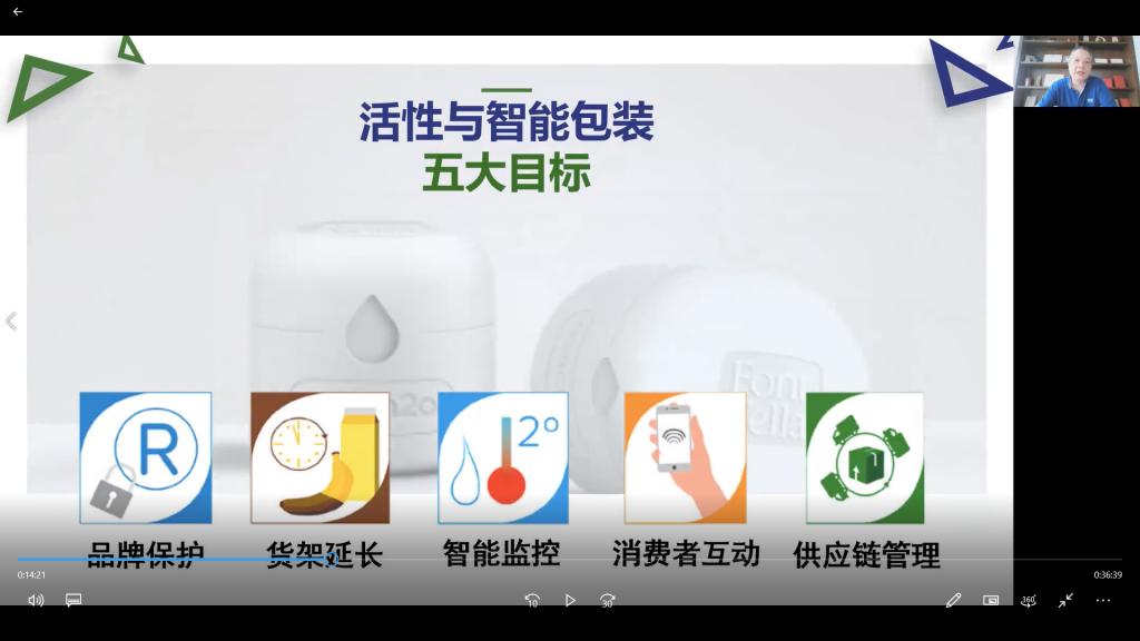 吳朝武董事長從介紹AIPIA協(xié)會組織近年來的工作入手,重點(diǎn)介紹了活性智能包裝材料的發(fā)展現(xiàn)狀及其應(yīng)用的各種實(shí)例,包括海鮮活性包裝方案、新鮮度標(biāo)簽、活性藥品解決方案、智能標(biāo)簽認(rèn)證與篡改證明、會播音樂的可樂、葡萄酒增強(qiáng)現(xiàn)實(shí)智能包裝等,并結(jié)合禁塑令,分析了包裝環(huán)?;内厔荨蟾鎯?nèi)容系統(tǒng)豐富,引人入勝。