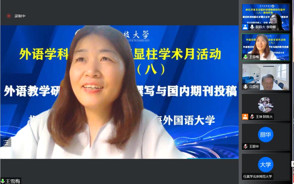 6月29日,上海外國(guó)語(yǔ)大學(xué)王雪梅教授做客我?!?span style="text-indent: 28px;">前沿科學(xué)報(bào)告”,做了題為“外語(yǔ)教學(xué)研究高水平論文撰寫與國(guó)內(nèi)期刊投稿”的線上報(bào)告。報(bào)告由我校外語(yǔ)學(xué)科特聘教授司顯柱主持,參會(huì)人數(shù)達(dá)300人。文理學(xué)院6月組織開展的外語(yǔ)學(xué)科特聘教授司顯柱學(xué)術(shù)活動(dòng)系列講座,旨在充分發(fā)揮我校特聘教授的學(xué)術(shù)引領(lǐng)和資源共享作用,推動(dòng)我校外語(yǔ)學(xué)科內(nèi)涵發(fā)展。
