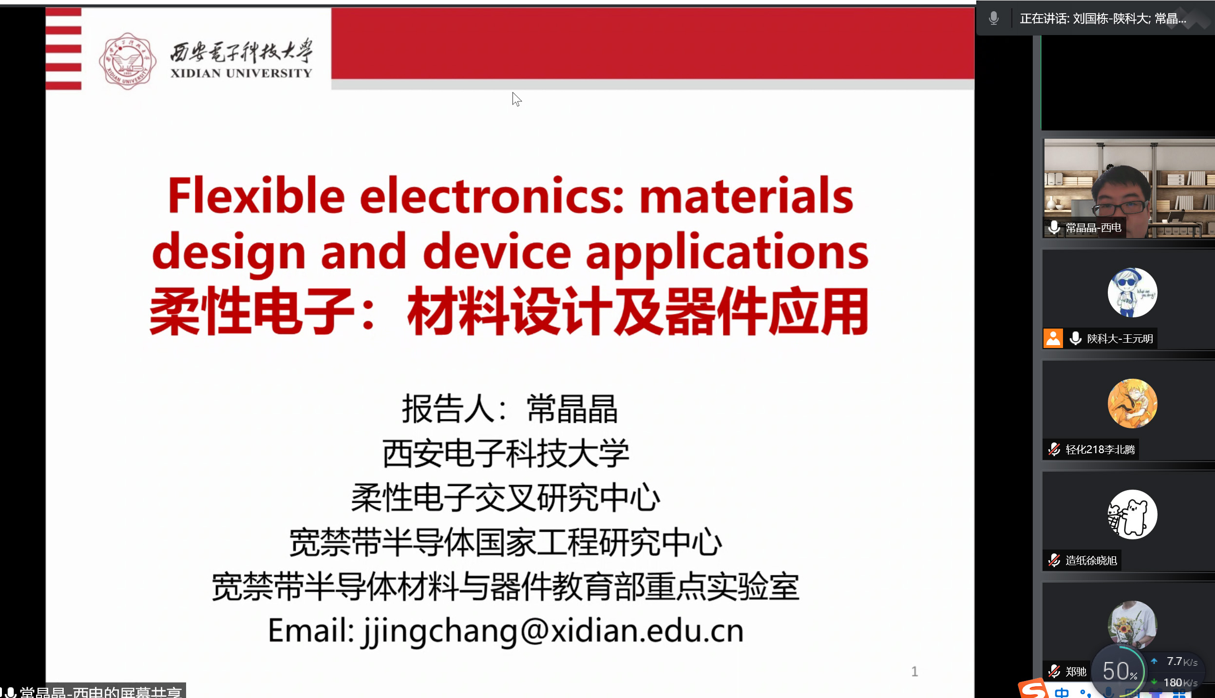 7月14日,應(yīng)我校輕工科學(xué)與工程學(xué)院、科技處及前沿院邀請,西安電子科技大學(xué)常晶晶教授做客我?!扒把乜茖W(xué)報告”,作了題為“Flexible electronics: materials design and device applications”的線上學(xué)術(shù)報告。報告會由輕工學(xué)院副院長劉國棟主持,學(xué)院相關(guān)專業(yè)教師、研究生參加了此次報告會。