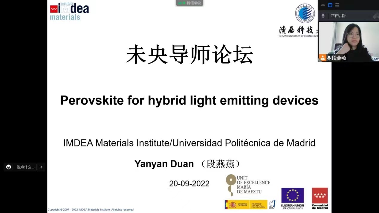 9月20日,應(yīng)我校環(huán)境科學(xué)與工程學(xué)院和研究生院的邀請(qǐng),馬德里理工大學(xué)段燕燕博士做客我?!拔囱雽?dǎo)師論壇”,做了題為“Perovskite for hybrid light emitting devices”的線上學(xué)術(shù)報(bào)告,環(huán)境學(xué)院相關(guān)專業(yè)教師、研究生參加了此次報(bào)告會(huì)。會(huì)議由環(huán)境學(xué)院學(xué)術(shù)院長王傳義教授主持。
