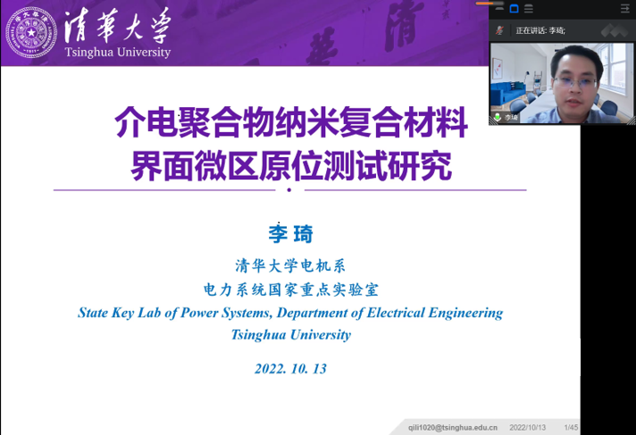 10月13日,應(yīng)輕工科學(xué)與工程學(xué)院(柔性電子學(xué)院)、科技處與前沿院邀請(qǐng),清華大學(xué)李琦副教授做客我校“前沿科學(xué)報(bào)告”,作了題為“介電聚合物納米復(fù)合材料界面微區(qū)原位測(cè)試研究”的線上學(xué)術(shù)報(bào)告。本次報(bào)告會(huì)由輕工學(xué)院柔性電子系主任劉漢斌主持,學(xué)院相關(guān)領(lǐng)域教師和研究生聆聽(tīng)了此次報(bào)告會(huì)。