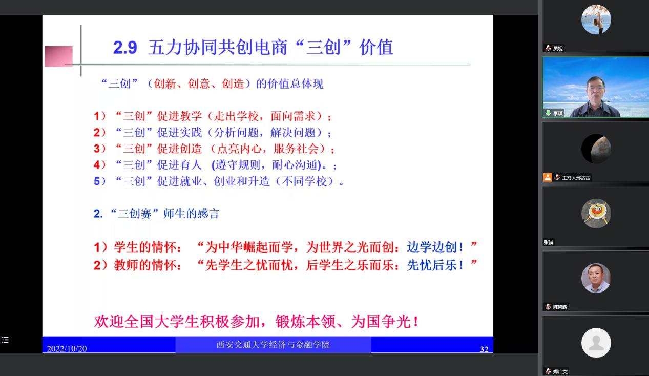 10月20日下午,應(yīng)教務(wù)處、經(jīng)濟(jì)與管理學(xué)院邀請,西安交通大學(xué)二級教授李琪做客我校“教育教學(xué)論壇”,作了題為《跨境電商發(fā)展與創(chuàng)新人才培育》的線上學(xué)術(shù)報告。本次報告會由經(jīng)管學(xué)院院長助理邢戰(zhàn)雷主持,學(xué)院教師及學(xué)生代表260余人通過騰訊會議以線上的方式參加了此次報告。