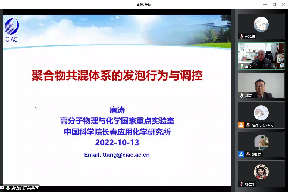 10月13日,受我??萍继?、化學(xué)與化工學(xué)院邀請,中國科學(xué)院長春應(yīng)用化學(xué)研究所唐濤研究院做客我?!扒把乜茖W(xué)報告”,為我校師生帶來題目為“聚合物共混體系的發(fā)泡行為與調(diào)控”的線上報告。報告由教務(wù)處副處長、化工學(xué)院邵亮教授主持,相關(guān)專業(yè)教師、研究生參加了此次報告。