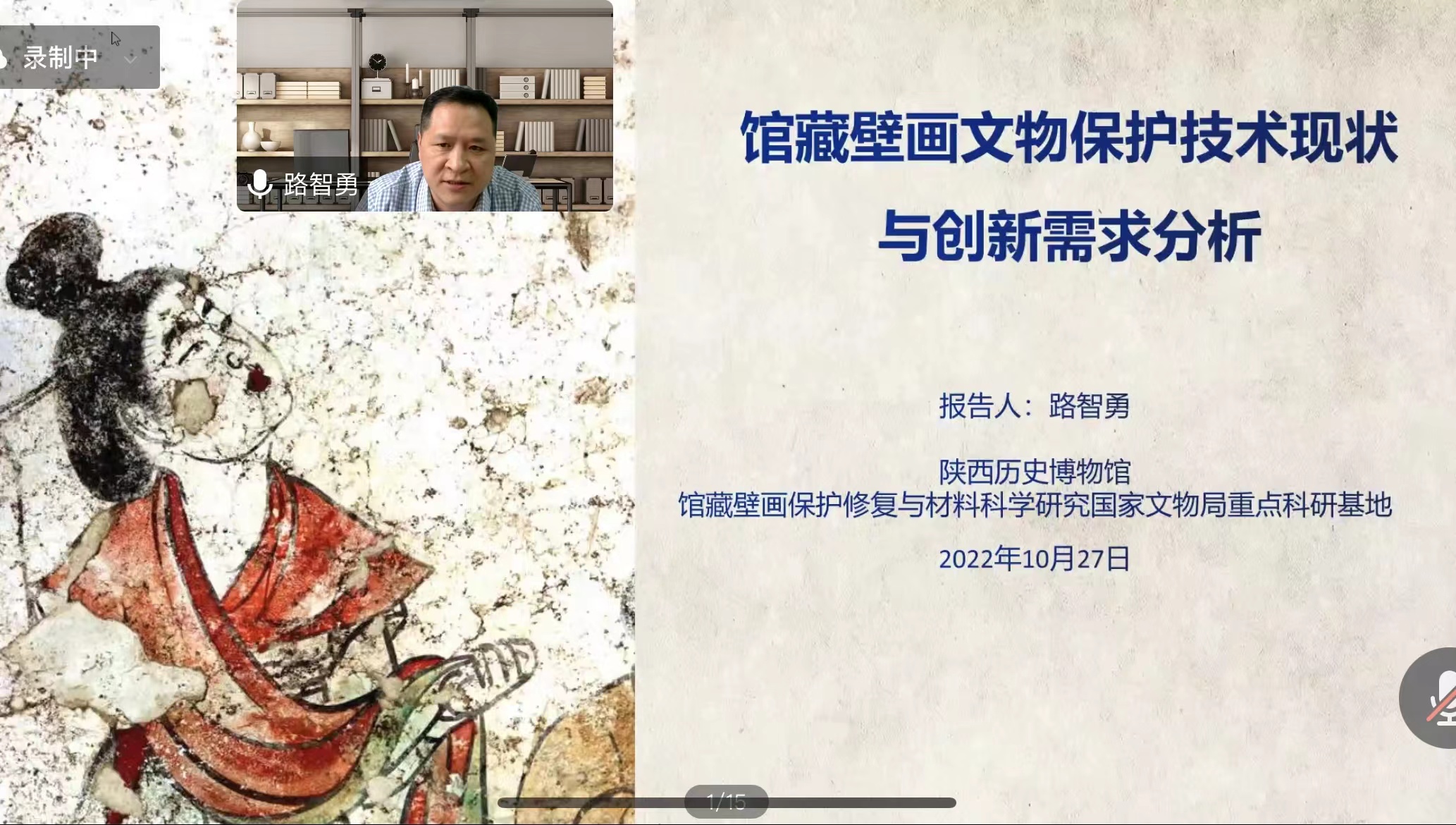 10月27日,應(yīng)我??萍继帯⒉牧峡茖W(xué)與工程學(xué)院(文物保護(hù)科學(xué)與技術(shù)學(xué)院)邀請(qǐng),陜西歷史博物館路智勇研究員做客我?!扒把乜茖W(xué)報(bào)告”,作了題為“館藏壁畫保護(hù)技術(shù)現(xiàn)狀與創(chuàng)新需求分析”的線上學(xué)術(shù)報(bào)告。報(bào)告由材料學(xué)院院長朱建鋒教授主持,學(xué)院相關(guān)領(lǐng)域教師和研究生參加了此次報(bào)告會(huì)。