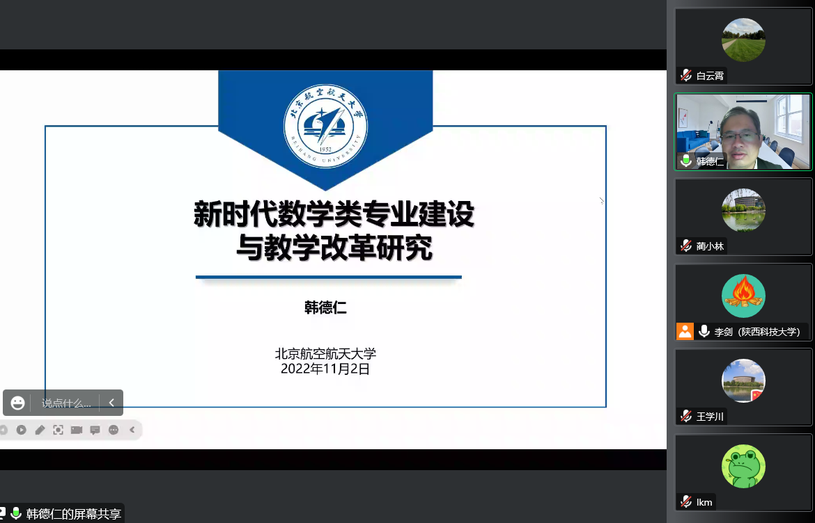 11月2日晚,應我校教務處、數(shù)學與數(shù)據(jù)科學學院邀請,北京航空航天大學韓德仁教授做客我?!敖逃虒W論壇”,做了題為“新時代數(shù)學類專業(yè)建設與教學改革研究”的線上學術(shù)報告。副校長王學川出席報告會并致辭。數(shù)學學院全體教師參加了本次學術(shù)報告會。報告會由數(shù)學學院院長李劍教授主持。