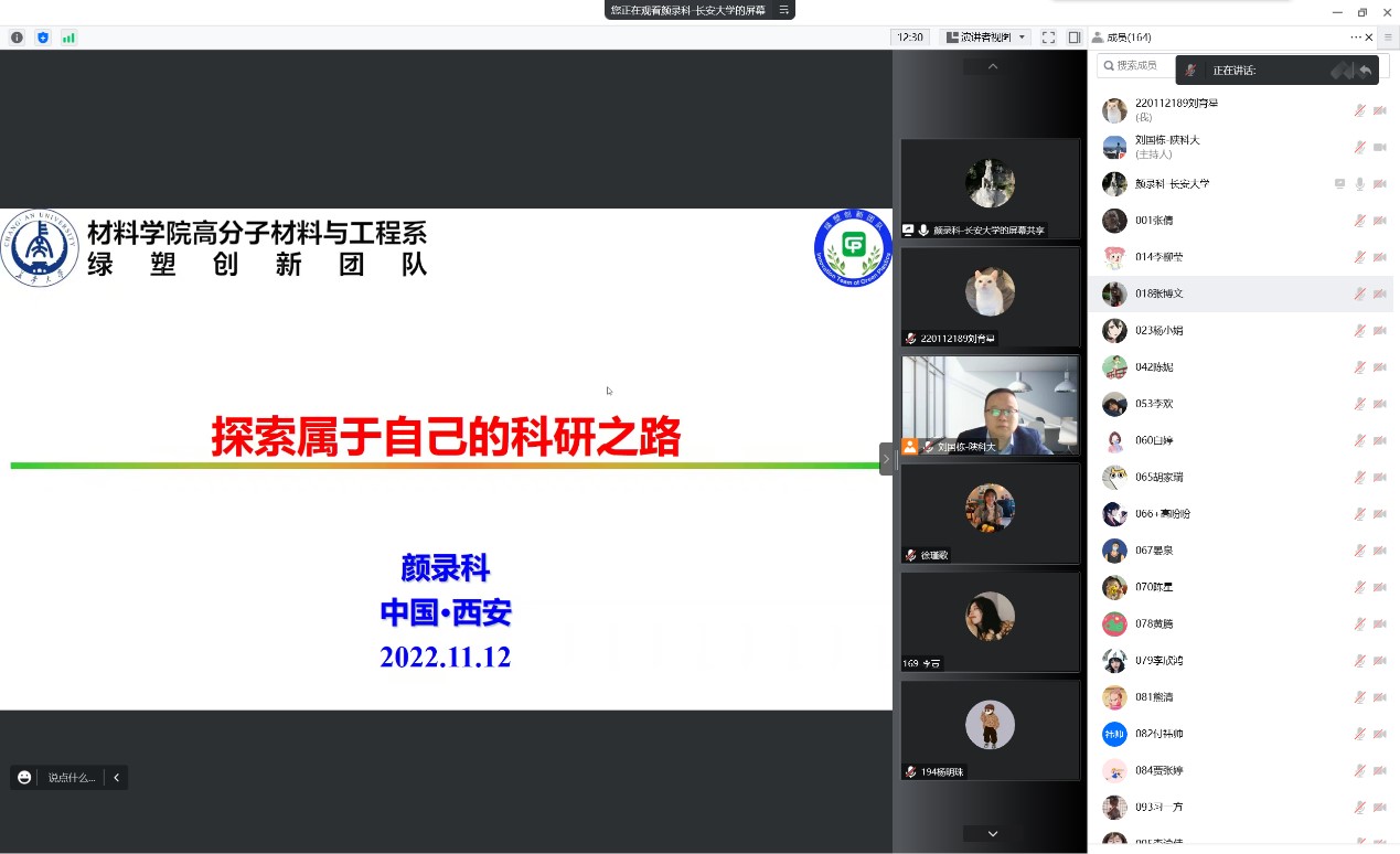 為了幫助研究生新生樹立正確的學(xué)習(xí)觀,掌握研究生階段的科研方法和學(xué)術(shù)規(guī)范,11月12日上午,我校研究生院和輕工科學(xué)與工程學(xué)院(柔性電子學(xué)院)邀請長安大學(xué)顏錄科教授做客“未央導(dǎo)師論壇”,作了題為“探索屬于自己的科研之路”的線上學(xué)術(shù)報告。報告會由輕工學(xué)院副院長劉國棟主持。學(xué)院2022級全體研究生新生參加了報告會。