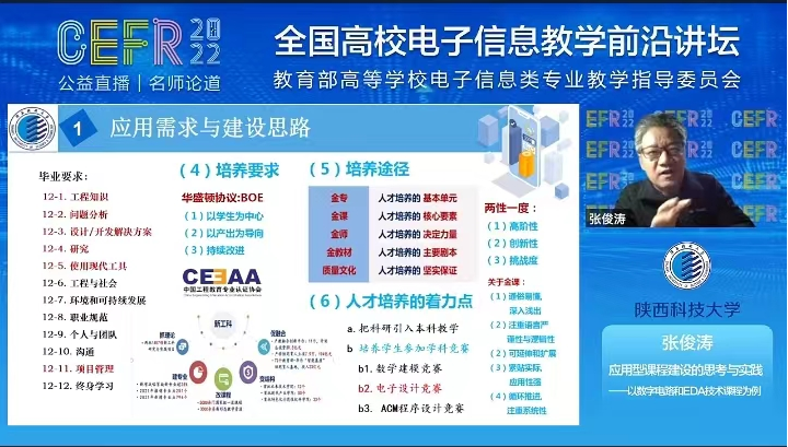 11月14日,受教育部高等學校電子信息專業(yè)教學指導委員會邀請,我校電子信息與人工智能學院張俊濤教授在全國高校電子信息教學前沿講壇上做了題為“應用型課程建設的思考實踐”的公益直播報告。