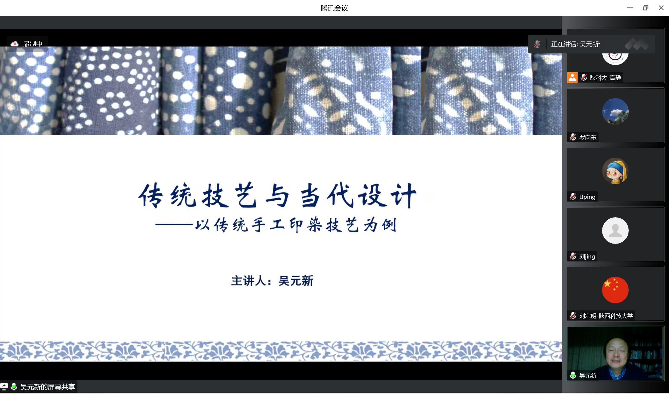 吳元新教授基于中國傳統(tǒng)民間印染技藝及其面向當代設計的創(chuàng)新轉(zhuǎn)化與發(fā)展,以藍印花布為例,對其制作工藝流程(刻板、刮漿、染色、晾曬、刮白)做了全方位的系統(tǒng)解構(gòu)和深度分析。吳教授熱情分享了藍印花布與現(xiàn)代服飾設計、當代視覺藝術(shù)設計等的深度介入及品牌合作和推廣,為傳統(tǒng)技藝與當代設計的完美融合提供了創(chuàng)新范本與實踐路徑。