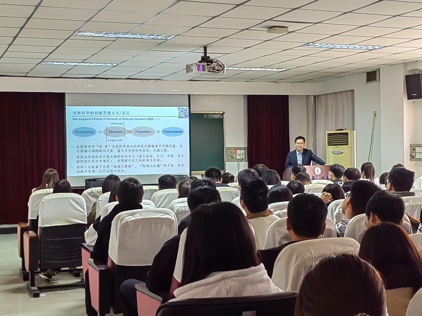 黃嘉興教授在報告中首先從材料科學(xué)的創(chuàng)新思維方式/范式入手,指引學(xué)生在材料科學(xué)中跨越多個空間尺度和時間尺度進(jìn)行思考,并指導(dǎo)學(xué)生發(fā)現(xiàn)復(fù)雜體系內(nèi)最關(guān)鍵的結(jié)構(gòu)單元,以便理解它們之間的相互作用,最后教會學(xué)生處理“局部與整體”“短期與長期”的矛盾,更好的認(rèn)識自然與社會的關(guān)系。同時黃教授通過簡單介紹自己的研究成果,極大的促進(jìn)同學(xué)們對于石墨烯的學(xué)習(xí)興趣。