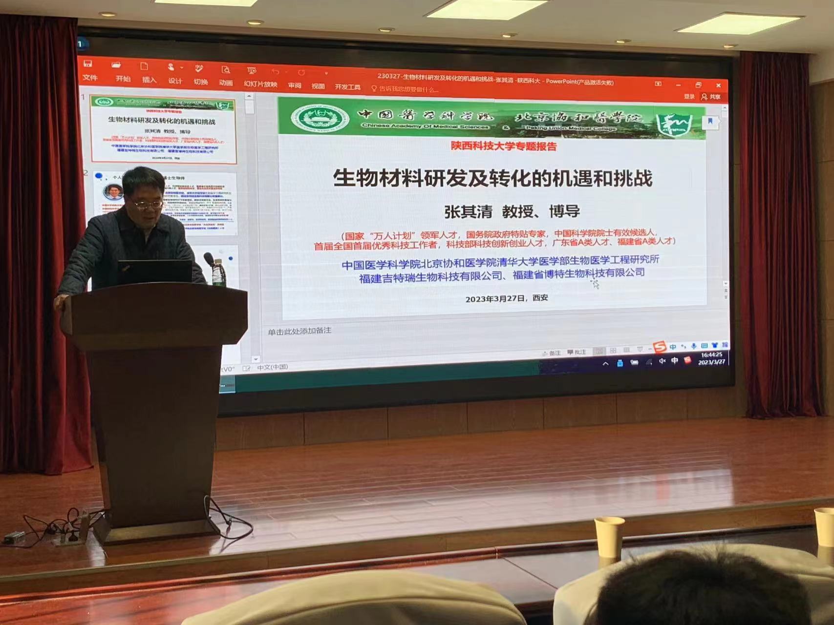 3月27日,應(yīng)我校輕工科學(xué)與工程學(xué)院(柔性電子學(xué)院)、科技處及前沿院邀請(qǐng),中國(guó)醫(yī)學(xué)科學(xué)院、北京協(xié)和醫(yī)學(xué)院、清華大學(xué)醫(yī)學(xué)部張其清教授做客我校“前沿科學(xué)報(bào)告”,為我校師生帶來(lái)一場(chǎng)題為“生物材料研發(fā)及轉(zhuǎn)化的機(jī)遇和挑戰(zhàn)”的學(xué)術(shù)報(bào)告。報(bào)告會(huì)由輕工學(xué)院陳詠梅教授主持,我校相關(guān)專(zhuān)業(yè)師生近百人參加了此次報(bào)告會(huì)。