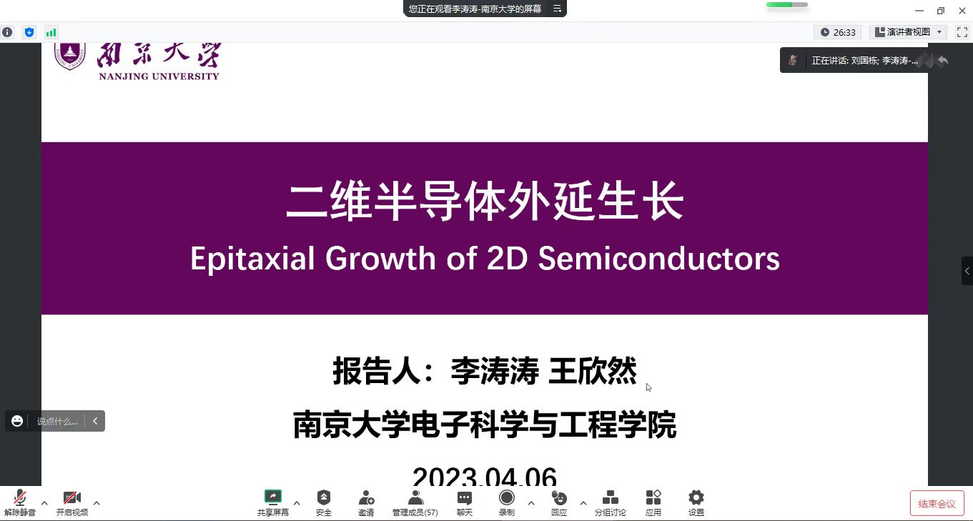 4月6日,應(yīng)柔性電子學(xué)院和研究生院邀請,南京大學(xué)李濤濤副研究員做客我?!拔囱雽?dǎo)師論壇”,作了題為“二維半導(dǎo)體外延生長”的線上學(xué)術(shù)報告。報告會由柔性電子學(xué)院副院長劉國棟主持,學(xué)院相關(guān)專業(yè)教師、研究生參加了此次報告會。