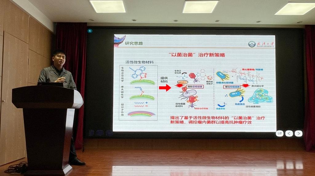 鄭迪威副研究員結(jié)合自己的科研工作,從活性微生物材料的構(gòu)建,“以菌治菌”治療新策略,“以菌代菌”治療新概念等方面詳細(xì)講解了活性微生物材料治療疾病的相關(guān)研究。微生物在人體健康中發(fā)揮著重要的作用,他重點講解了以菌群為靶點治療重大疾病,基于主客體作用、疏水作用力、兩親性分子自組裝構(gòu)建了融合高分子材料與微生物彼此優(yōu)勢的活性微生物材料。這些微生物材料可以通過精準(zhǔn)調(diào)控口腔菌群,上調(diào)抗癌菌,下調(diào)促癌菌等方法治療多種人體代謝性疾病。