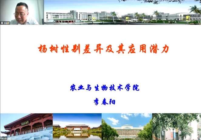 李春陽為與會師生作了題為“楊樹性別差異及其應(yīng)用潛力”的學(xué)術(shù)報告,他首先介紹了雌雄異株植物的重要性,進而以青楊為例闡釋了雌雄異株植物形態(tài)、生理、生化和亞細胞結(jié)構(gòu)對干旱、重金屬等環(huán)境脅迫因素的響應(yīng)規(guī)律及其交互作用。報告會尾聲,李春陽教授與在場師生進行了深入的交流討論,并耐心地解答了相關(guān)問題,拓寬了師生的科研思路與視野。
