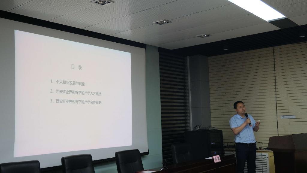 報告會上,蔡鵬首先介紹了西安軟件園基本情況和園區(qū)產(chǎn)業(yè)布局;并結(jié)合個人職業(yè)發(fā)展經(jīng)驗,從西安IT產(chǎn)業(yè)企業(yè)情況、IT人才圈層與鏈接、IT產(chǎn)業(yè)紅利及人才紅利變化、就業(yè)市場觀察等方面對行業(yè)需求變化趨勢進(jìn)行了全面的分析講解;最后介紹了IT業(yè)界視野下的產(chǎn)學(xué)合作策略、本科人才培養(yǎng)模式、雙師型教師培訓(xùn)等方面的內(nèi)容。
