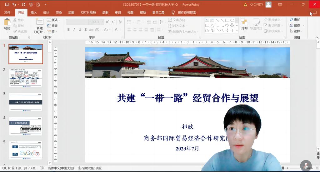 祁欣研究員首先介紹了“一帶一路”倡議提出以來,我國與沿線國家經(jīng)貿(mào)合作的發(fā)展進程,并用豐富的案例展現(xiàn)了我國與沿線國家在“政策溝通、設(shè)施聯(lián)通、貿(mào)易暢通、資金融通、民心相通”方面取得的成就。隨后從世界經(jīng)濟困境、大國博弈、地緣政治沖突、后疫情重建等方面分析了“一帶一路”經(jīng)貿(mào)合作面臨的挑戰(zhàn),提出未來可以通過加強更多國家合作、拓展更廣合作領(lǐng)域、促進更高水平合作、推動更深層次合作、發(fā)展新業(yè)態(tài)新模式、構(gòu)建更緊密合作紐帶、統(tǒng)籌發(fā)展與安全來持續(xù)推進“一帶一路”經(jīng)貿(mào)合作。