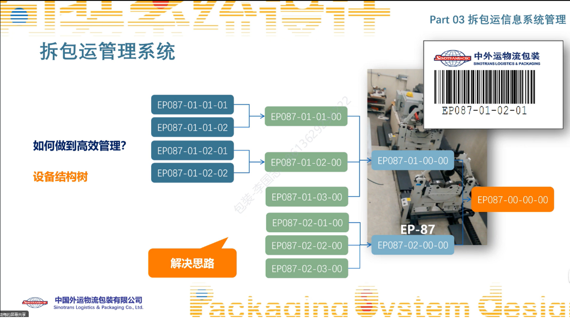 孟曉梅總經(jīng)理首先以高端制造業(yè)生產(chǎn)線、石化和鋼鐵等大型室外工廠的搬遷項(xiàng)目為切入點(diǎn),介紹了“拆遷-包裝-運(yùn)輸”一體化的概念和項(xiàng)目流程、拆包運(yùn)的信息系統(tǒng)管理與技術(shù)融合、EGS雙碳戰(zhàn)略與物流包裝一體化等方面的內(nèi)容,并分享了團(tuán)隊(duì)在拆包運(yùn)一體化設(shè)計(jì)和智能包裝技術(shù)方面的創(chuàng)新成果。