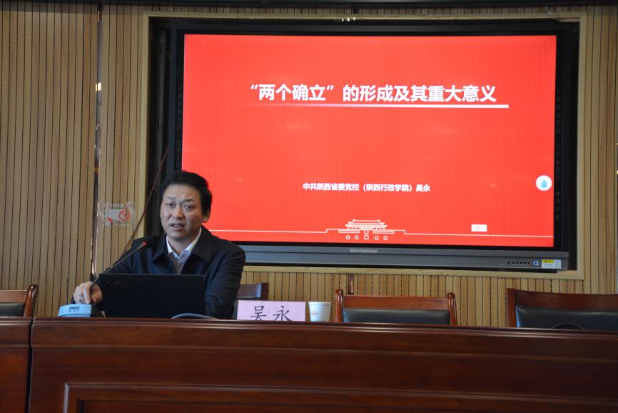 為了進(jìn)一步學(xué)習(xí)貫徹黨的二十大精神,深刻領(lǐng)會(huì)“兩個(gè)確立”的決定性意義,明確中國(guó)式現(xiàn)代化新道路的理論特點(diǎn),馬克思主義學(xué)院邀請(qǐng)中共陜西省委黨校(陜西行政學(xué)院)副校長(zhǎng)吳永教授于10月8日在馬院學(xué)術(shù)報(bào)告廳作了題為《“兩個(gè)確立”的形成及重大意義》的“前沿科學(xué)報(bào)告”。講座由院長(zhǎng)吳明永主持,馬院全體師生參加了學(xué)習(xí)。