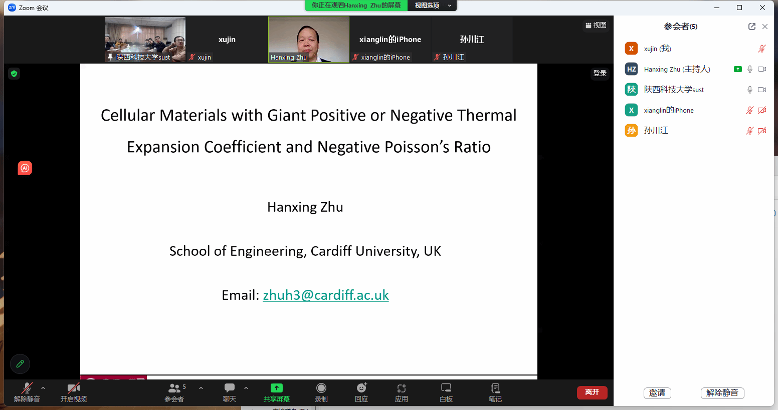 11月27日,應(yīng)科技處與機(jī)電工程學(xué)院(智能制造與機(jī)器人工程學(xué)院)邀請(qǐng),英國(guó)卡迪夫大學(xué)朱漢興教授做客我?!扒把乜茖W(xué)報(bào)告”,作了題為“Cellular Materials with Giant Positive or Negative Thermal Expansion Coefficient and Negative Poisson’s Ration”的學(xué)術(shù)報(bào)告。報(bào)告會(huì)由機(jī)電學(xué)院李晨教授主持,機(jī)電學(xué)院副院長(zhǎng)楊立軍教授、微納機(jī)電研究所老師和部分研究生參加報(bào)告。