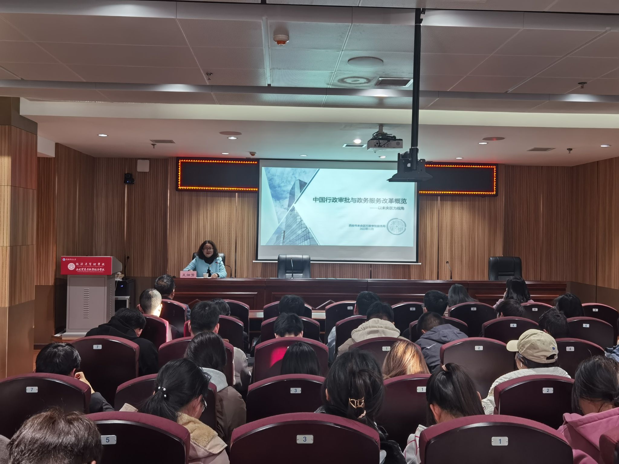 11月30日下午,西安市未央?yún)^(qū)行政審批服務(wù)局局長王細(xì)芳作客我?!敖逃虒W(xué)論壇”,做了題為《中國行政審批與政務(wù)服務(wù)改革概覽——以未央?yún)^(qū)為視角》的學(xué)術(shù)報(bào)告。本次報(bào)告由教務(wù)處主辦、經(jīng)濟(jì)與管理學(xué)院(亞歐貿(mào)易與數(shù)字經(jīng)濟(jì)學(xué)院)承辦。教師及學(xué)生代表100余人參加了此次報(bào)告。